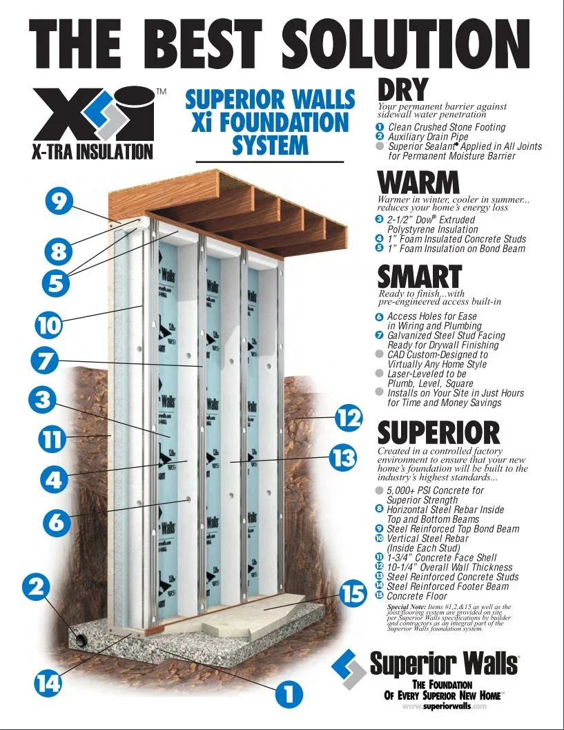 Superior Walls is a paneling system that can be placed below or above grade (up to three stories). It has been around for 35 years but they are not mainstream. At least not in my Architecture world. I went online and found great and horrendous opinions. However, all the horrendous comments were mainly due to bad building techniques or cutting corners in the installation process.