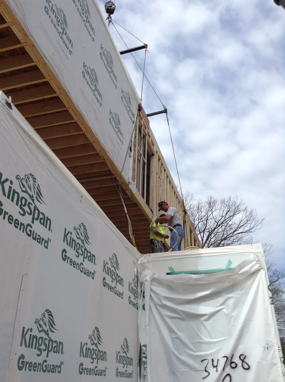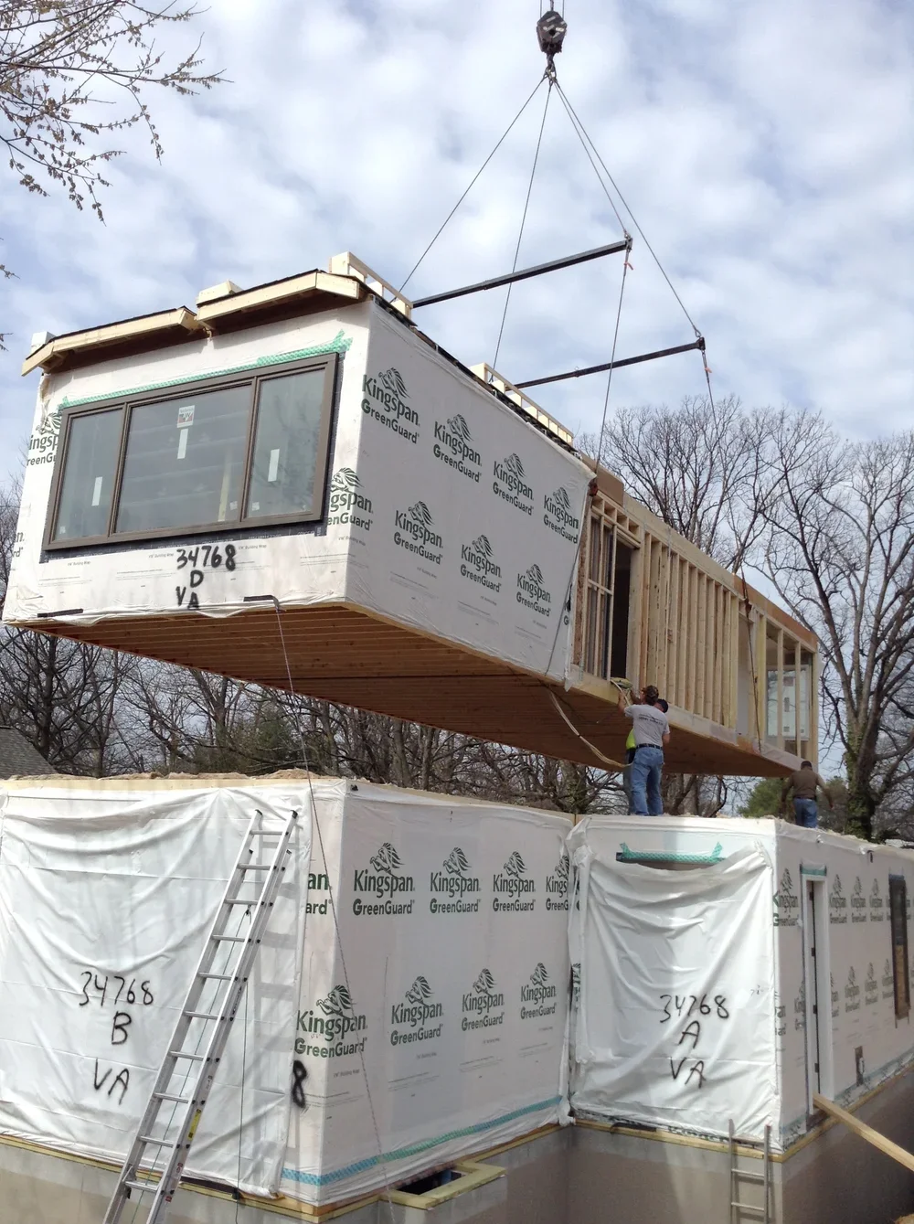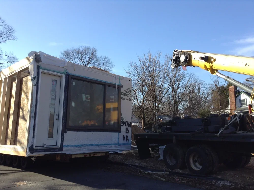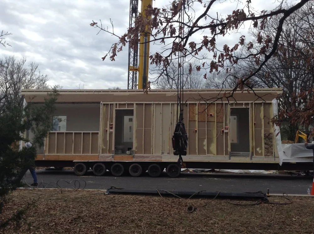 I arrived at 7:12 and the crane was there as well as the first modular unit. There were two units 15'-10" wide and another two at 8'-0". The 15'-10" trailers required safety drivers behind them and cost an additional $1,800 than a typical trailer. Now you know.